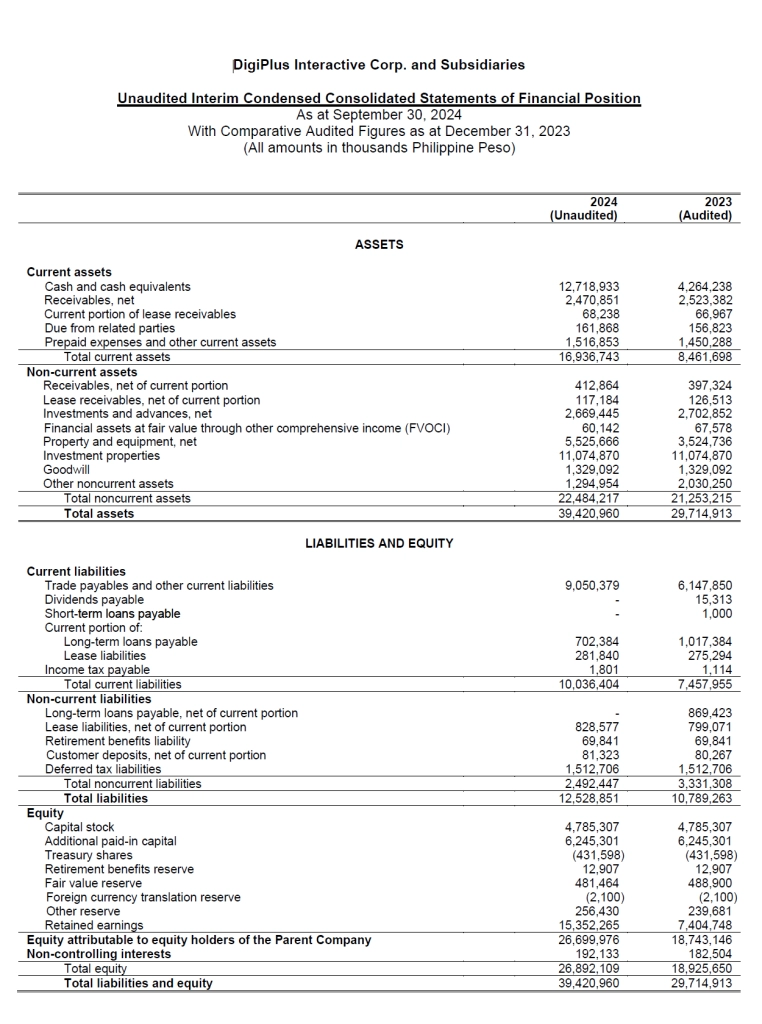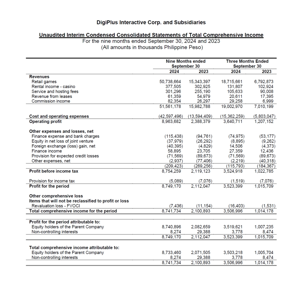 The strong performance was driven by the robust growth of the retail games segment, introduction of new product offerings, and cost efficiencies. Over the past year, DigiPlus launched diversified offerings that cater to a broader spectrum of demographics, driving higher user engagement, attracting new customer segments, and contributing to substantial revenue growth.